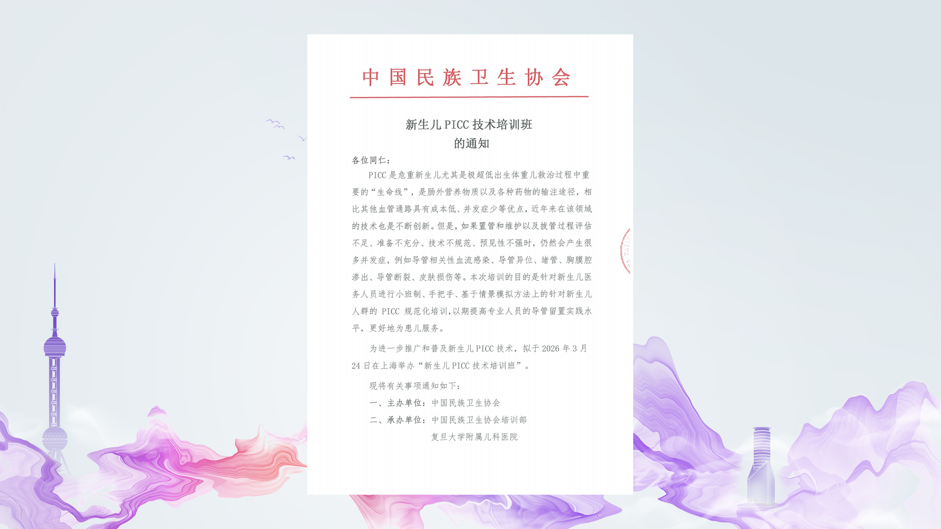 为进一步推广和普及新生儿PICC技术,拟于2026年3月24日-27日在上海举办“新生儿PICC技术培训班”中国民族卫生协会培训部 蒋大伟18601131129