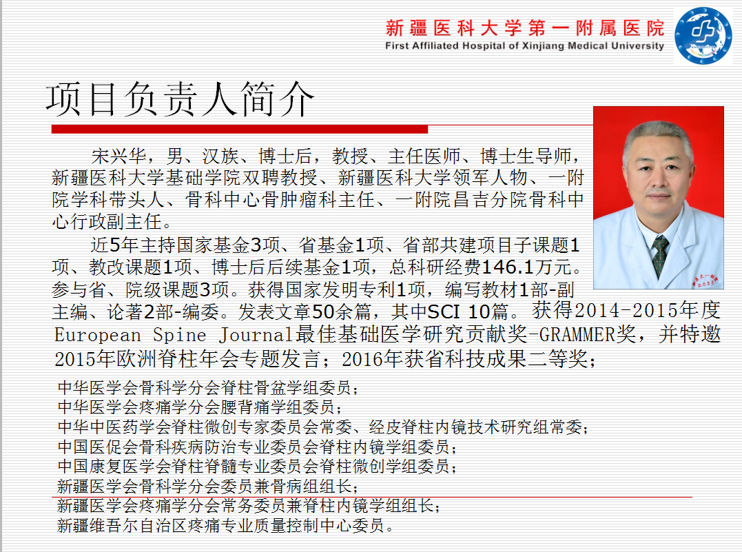 响应国家”一带一路”的健康医疗政策,落实国家对西部基层医疗单位的技术帮扶,更好的促进国家对少数民族地区医疗扶持政策的发展。通过“新疆地区椎间孔镜的规范化手术治疗”适宜项目的推广进一步加强对经皮脊柱内镜技术的认识、规范技术操作、提高诊疗水平。