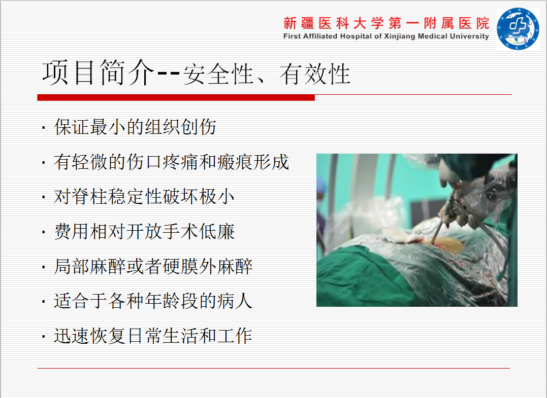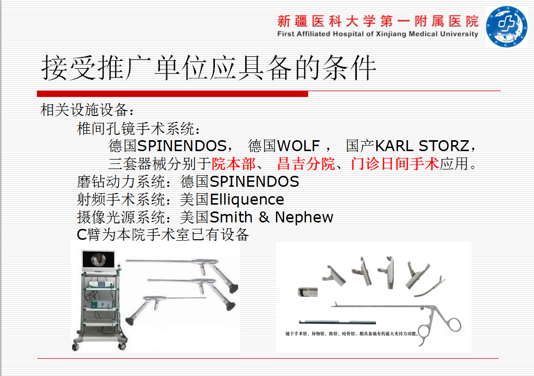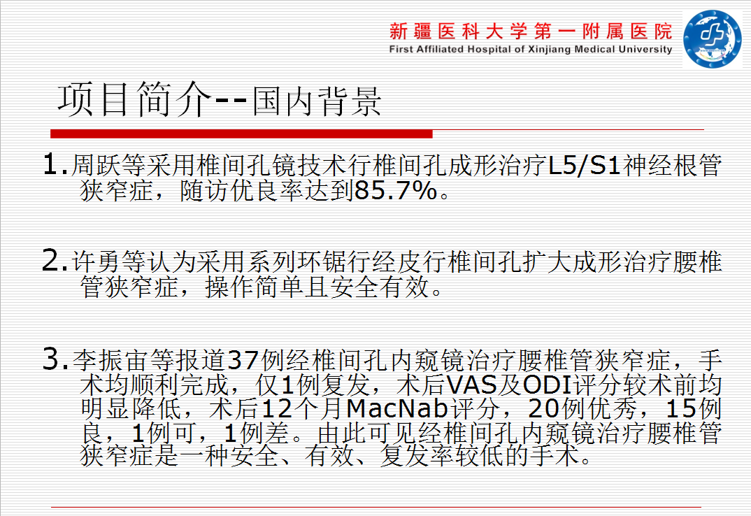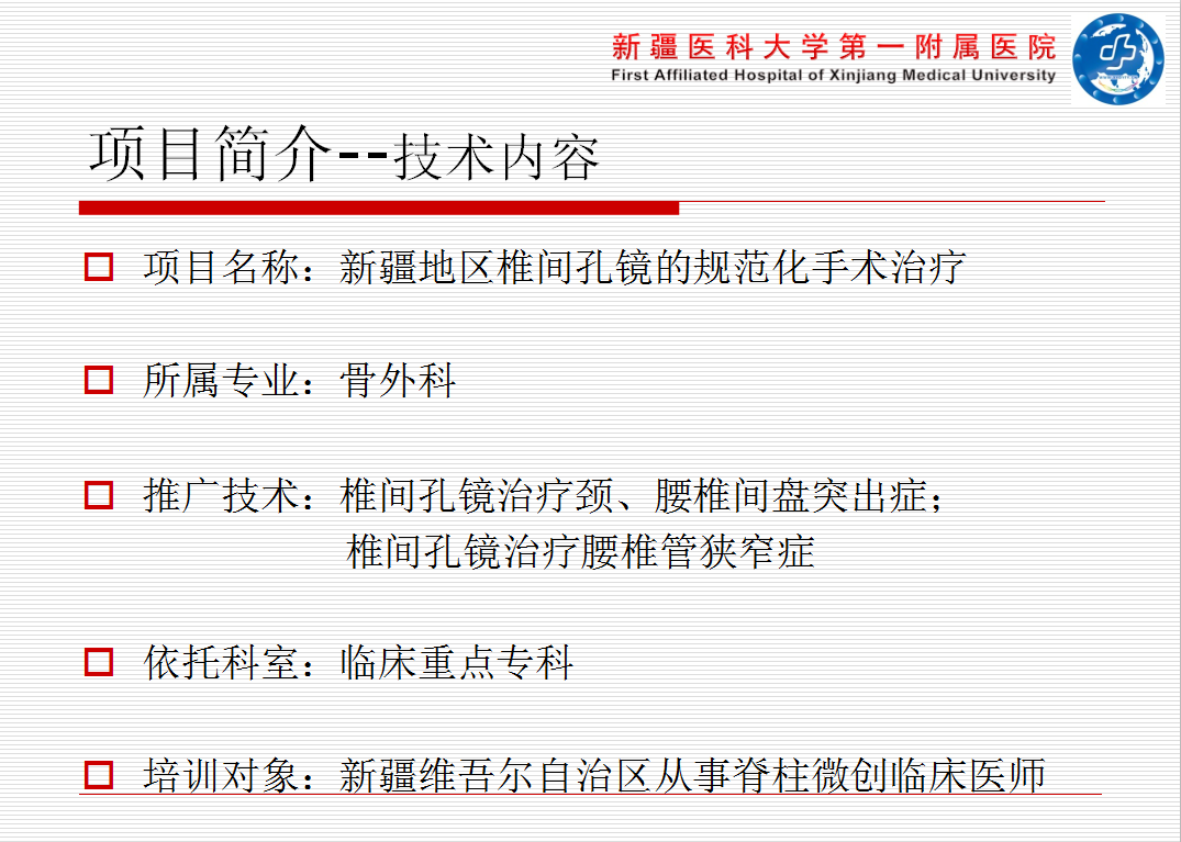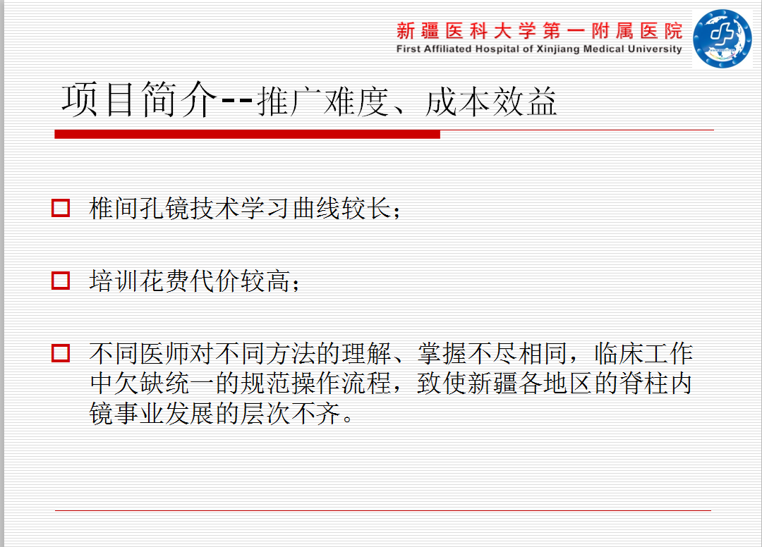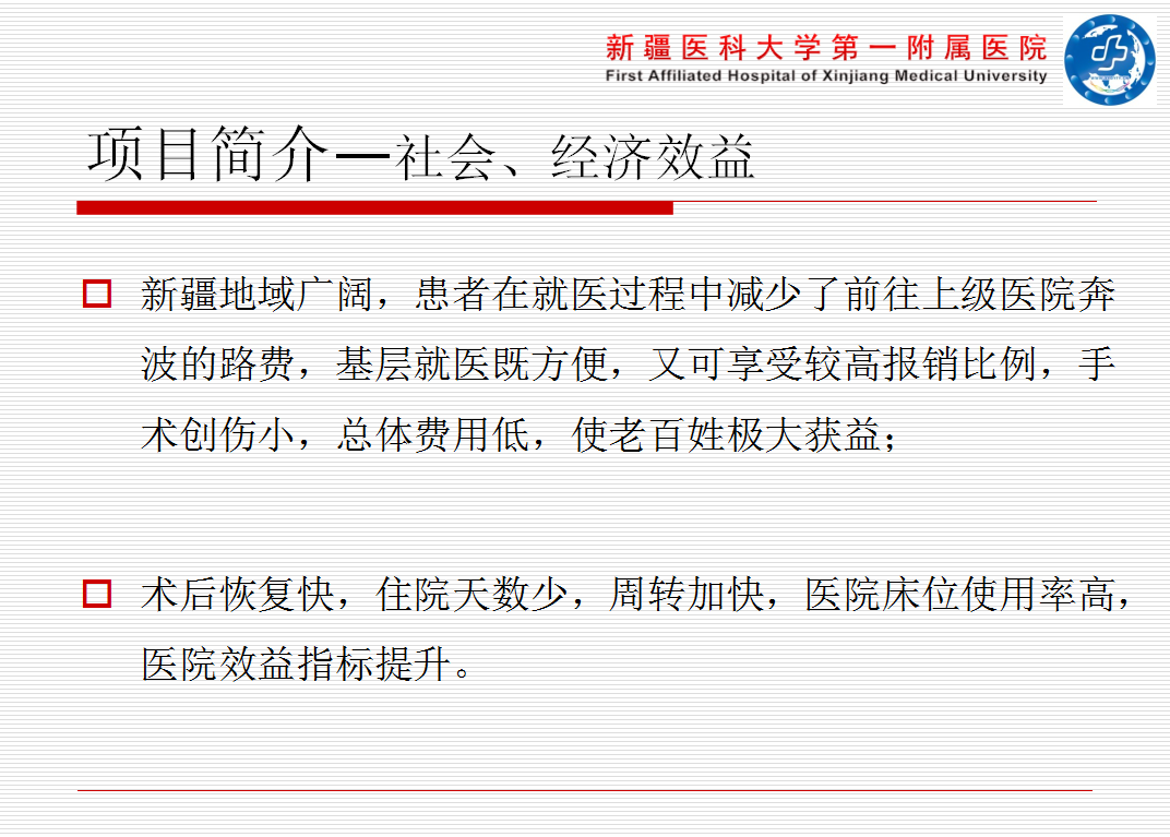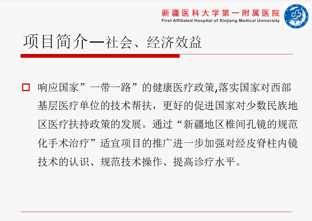 此次适宜项目推广后使新疆各地州的脊柱内镜微创事业的发展更稳步,扶持基层医疗,使基层医院的医疗水平的到大幅度提高。