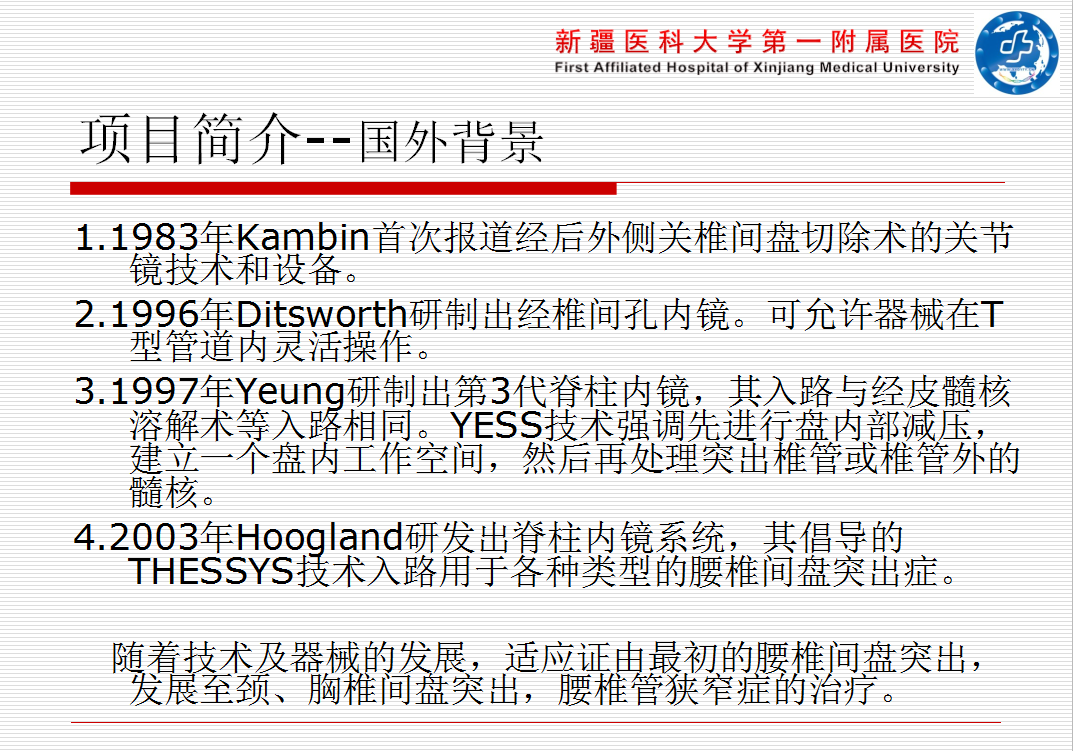 1998年美国Anthony Yeung医生(美国微创学主席)研制出椎间孔镜YESS技术,2002年Hoogland教授(欧洲微创学前任主席)在YESS技术的基础上研发出椎间孔镜THESSYS技术,使椎间孔镜技术走向成熟。Ruetten教授先后在2007年、2009年首次提出经颈椎后路内窥镜下治疗颈椎间盘突出症与腰椎管狭窄症,打开椎间孔镜技术在治疗脊柱退行性病变中的新局面,将脊柱微创治疗推向全新的高度。椎间孔镜下微创手术具有创伤少、恢复快、出血少、不影响脊柱稳定性、住院时间短、医疗费用低、术后仅有轻微的伤口疼痛和颈部小疤痕,可迅速恢复日常生活和工作。是目前最安全、最经济、创伤最小的手术方式。