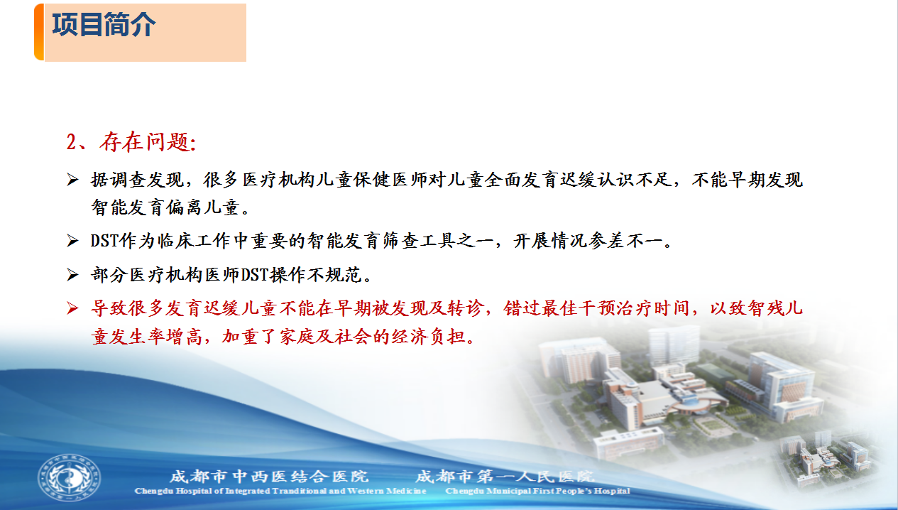 据调查发现,很多医疗机构儿童保健医师对儿童全面发育迟缓认识不足,不能早期发现智能发育偏离儿童,同时0~6岁儿童智能发育筛查测验(DST)作为临床工作中重要的智能发育筛查工具之一,在不同级别医疗机构儿童保健工作中开展情况参差不一,部分医疗机构儿童保健医师操作不规范,尤其基层医院儿保医师对其认识不足,很多尚未开展DST测验,导致很多发育迟缓儿童不能在早期被发现及转诊,错过了最佳干预治疗时间,导致了智残儿童发生率的增高,加重了家庭及社会的经济负担。因此在基层医院普及DST应用,规范各级医疗机构儿保医师的DST操作是我们目前的重要工作之一,对降低或减少智残儿童的发生率,节约医疗资源,减少家庭及社会经济负担,其意义重大。