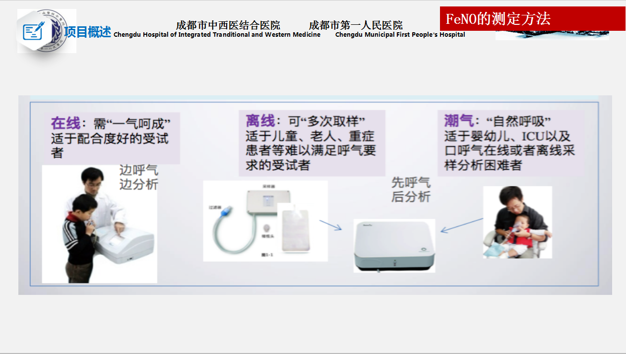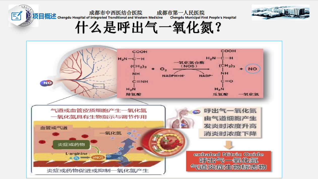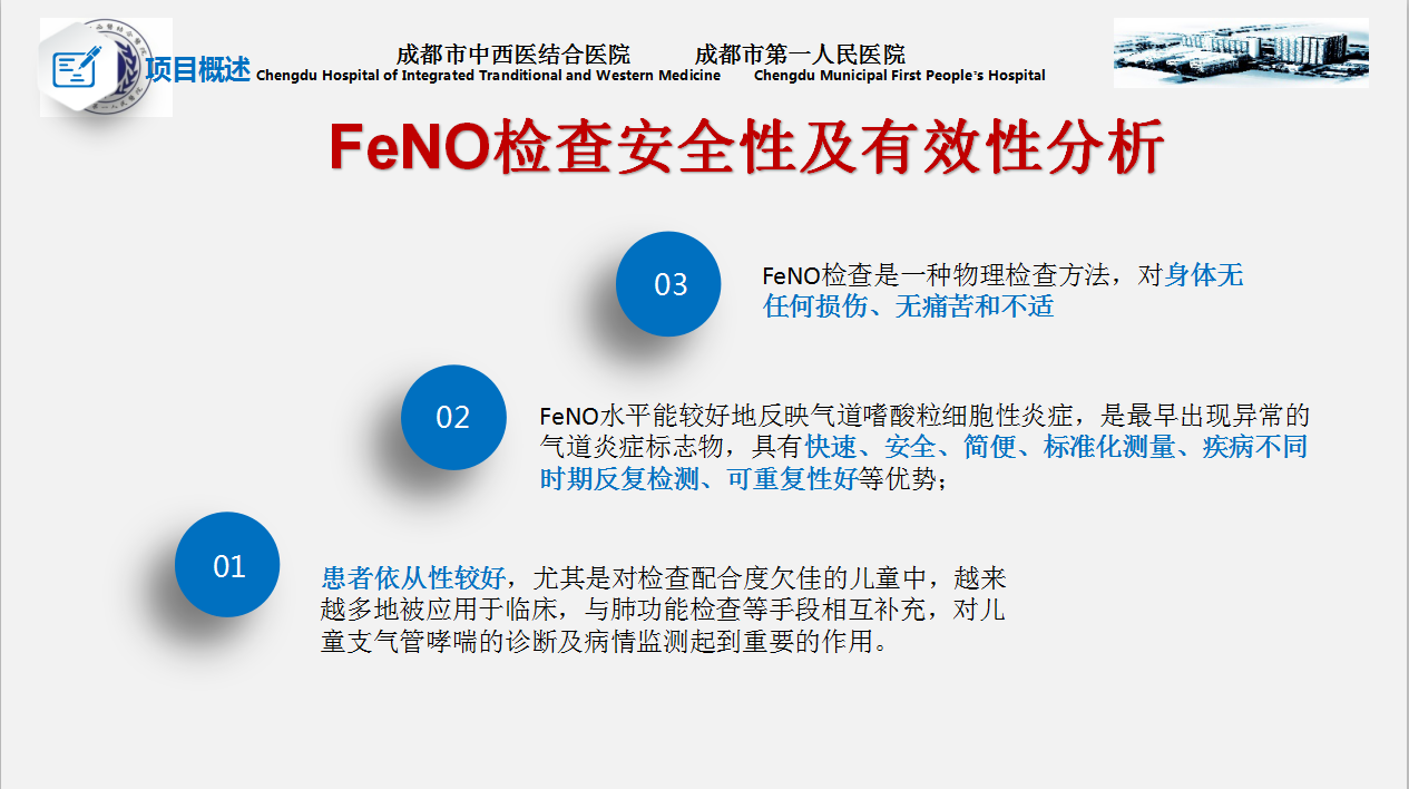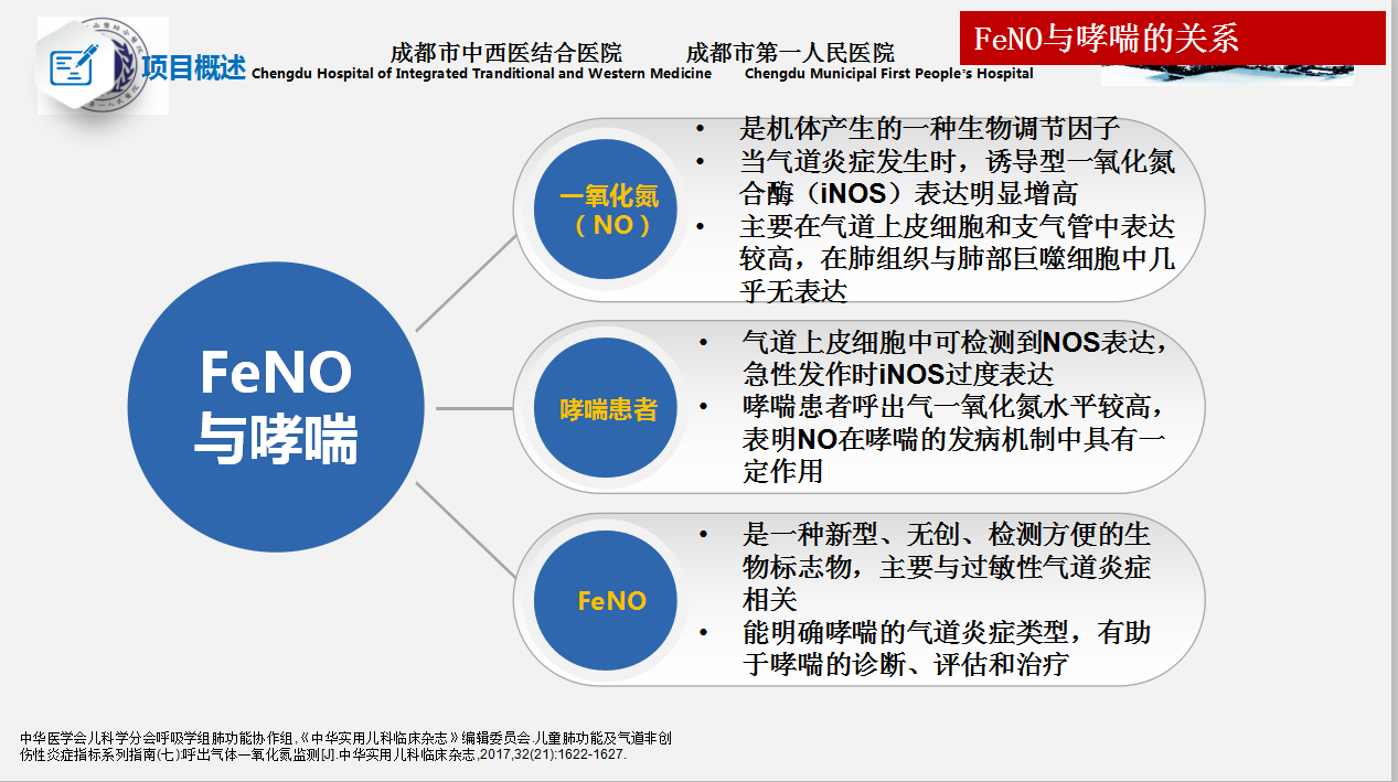 1991年国外学者首次报道FeNO可用于诊断气道炎性疾病以来,FeNO检测技术已历经20多年发展历史。目前,临床已广泛采用经批准上市的标准化技术、设备检测FeNO,具有结果精确、数据可靠、重复性好等优点,是一种理想的气道炎性疾病无创检查技术。我科是国家级区域儿科中医诊疗中心,四川省甲级重点专科,儿科呼吸中心依托七十载医学沉淀和浓厚的中西医结合文化,在省内享有较高知名度。在临床医疗、教学、科研和住院医师规范化培训等方面取得显著成绩,是一支具有医疗能力强、质量高、管理规范的呼吸专科团队。在四川省综合医院中,率先开展呼出气一氧化氮检测(2013年开展以来已成功完成3000余例FeNO检查),开展了儿童肺功能检查、儿童过敏原检测、纤维支气管镜检查等技术,走在了省市综合医院的前列。中心在婴幼儿喘息、重症肺炎、难治性呼吸系统感染性疾病、儿童哮喘、慢性咳嗽、慢性肺部疾患等诊治水平等方面达到四川省领先地位。中心人才济济,技术力量雄厚,人才梯队结构合理。现有医护人员35人,其中高级职称5名,硕士研究生12名。是四川省儿科呼吸专委会委员、西南哮喘协作组联盟委员、四川省哮喘防治小组成员单位。同时,中心承担了多个医学院校的教学任务。主持了“呼出气一氧化氮与肺功能在学龄前期哮喘儿童中的变化及相关性分析”等省市级的多个科研课题。儿科主任向龙主任医师对儿童FeNO检查具有丰富的理论知识及临床经验,且科室人员定期进行相关技术培训,并有一整套的操作规范和工作流程。从服务病人,提高临床诊疗水平,促进科室发展的角度出发,我科将推广开展呼出气一氧化氮检查。