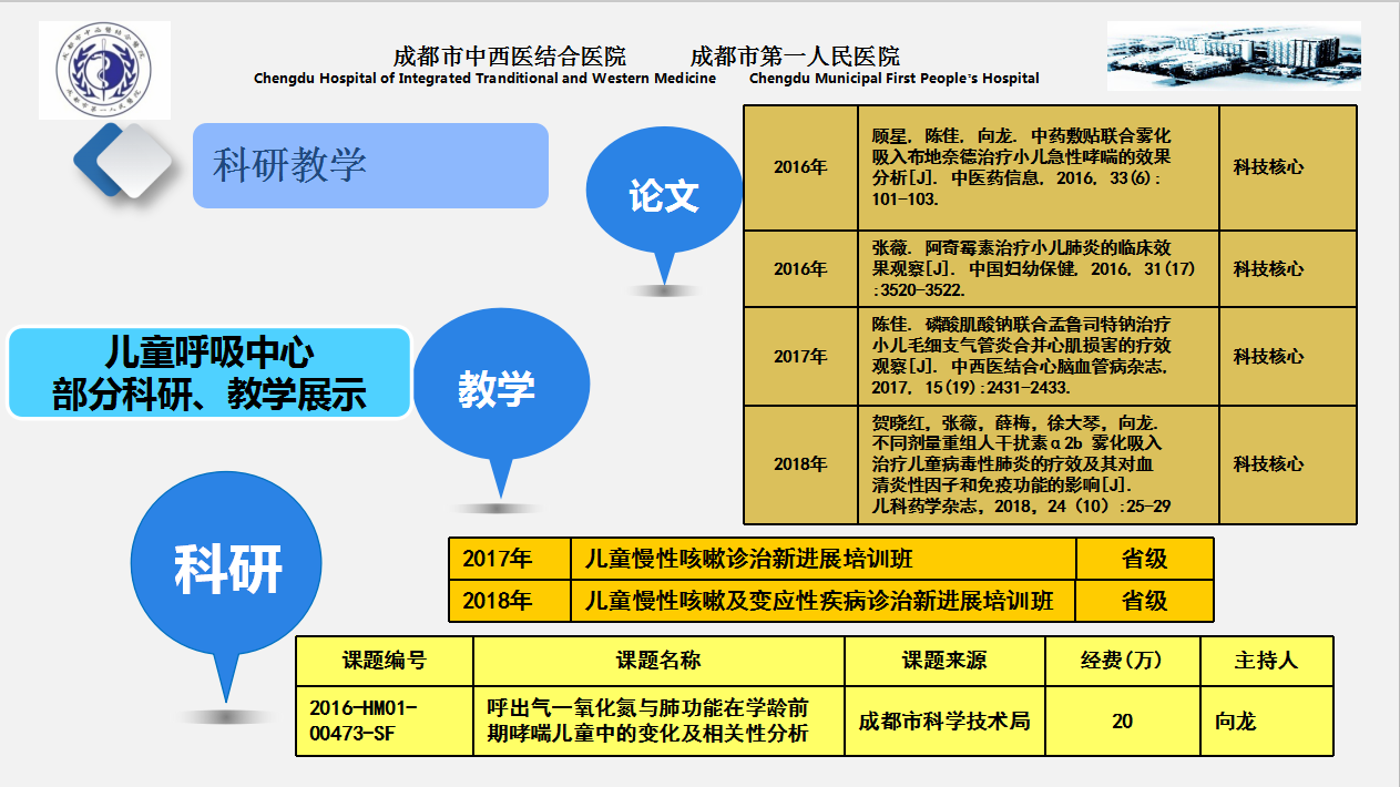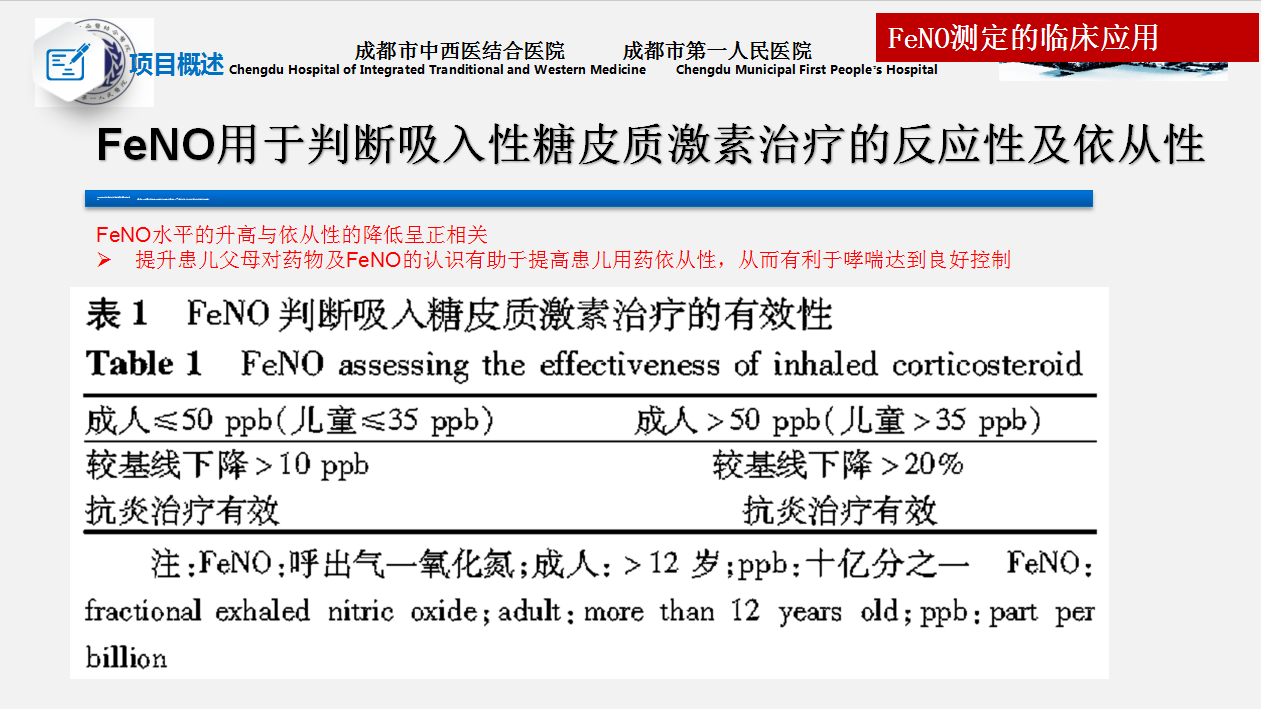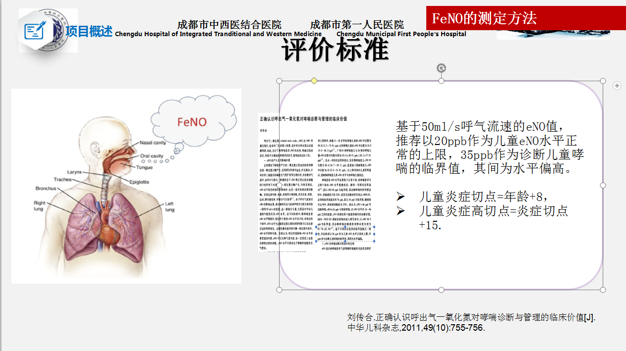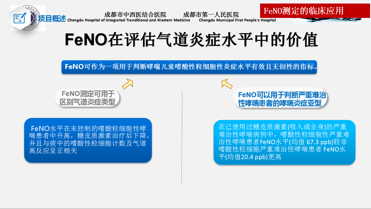 1991年国外学者首次报道FeNO可用于诊断气道炎性疾病以来,FeNO检测技术已历经20多年发展历史。目前,临床已广泛采用经批准上市的标准化技术、设备检测FeNO,具有结果精确、数据可靠、重复性好等优点,是一种理想的气道炎性疾病无创检查技术。我科是国家级区域儿科中医诊疗中心,四川省甲级重点专科,儿科呼吸中心依托七十载医学沉淀和浓厚的中西医结合文化,在省内享有较高知名度。在临床医疗、教学、科研和住院医师规范化培训等方面取得显著成绩,是一支具有医疗能力强、质量高、管理规范的呼吸专科团队。在四川省综合医院中,率先开展呼出气一氧化氮检测(2013年开展以来已成功完成3000余例FeNO检查),开展了儿童肺功能检查、儿童过敏原检测、纤维支气管镜检查等技术,走在了省市综合医院的前列。中心在婴幼儿喘息、重症肺炎、难治性呼吸系统感染性疾病、儿童哮喘、慢性咳嗽、慢性肺部疾患等诊治水平等方面达到四川省领先地位。中心人才济济,技术力量雄厚,人才梯队结构合理。现有医护人员35人,其中高级职称5名,硕士研究生12名。是四川省儿科呼吸专委会委员、西南哮喘协作组联盟委员、四川省哮喘防治小组成员单位。同时,中心承担了多个医学院校的教学任务。主持了“呼出气一氧化氮与肺功能在学龄前期哮喘儿童中的变化及相关性分析”等省市级的多个科研课题。儿科主任向龙主任医师对儿童FeNO检查具有丰富的理论知识及临床经验,且科室人员定期进行相关技术培训,并有一整套的操作规范和工作流程。从服务病人,提高临床诊疗水平,促进科室发展的角度出发,我科将推广开展呼出气一氧化氮检查。