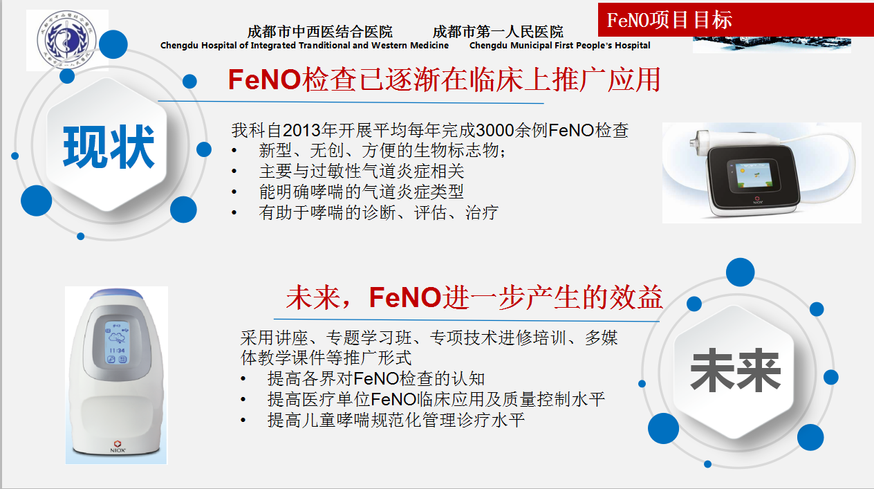 通过采用讲座、专题学习班、专项技术进修培训、多媒体教学课件等多种推广形式一方面提高各界对FeNO检查的认知,让各医疗单位了解到FeNO检查是一项能促进临床与科研,并具有良好社会效益和经济效益的项目,将有利于提高成都市以及四川省FeNO临床应用及质量控制水平,另一方面旨在加强儿童呼吸专业人员对呼出气一氧化氮检查、理论知识和操作技术的培训,使技术规范化;提高临床医师对FeNO检查应用价值的认识水平,让其掌握检查思路和结合临床对检查结果分析的方法,从而提高我省儿童哮喘规范化管理诊疗水平。